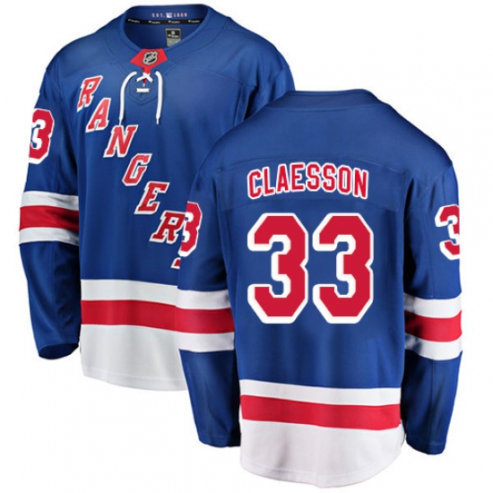 >Men's New York Rangers #33 Fredrik Claesson Fanatics Branded Royal Blue Home Breakaway NHL Jersey
