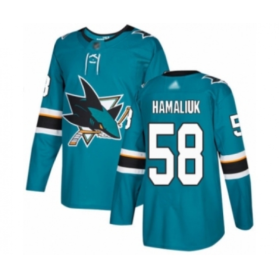 >Men's San Jose Sharks #58 Dillon Hamaliuk Authentic Teal Green Home Hockey Jersey