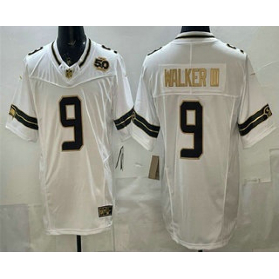 >Men's Seattle Seahawks #9 Kenneth Walker III White Gold FUSE 50th Season Vapor Limited Stitched Jersey
