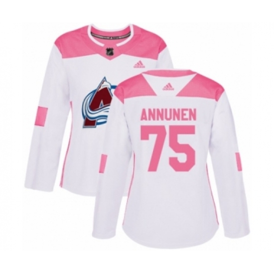 >Women's Adidas Colorado Avalanche #75 Justus Annunen Authentic White Pink Fashion NHL Jersey