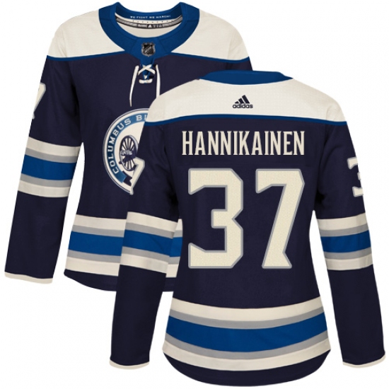 >Women's Adidas Columbus Blue Jackets #37 Markus Hannikainen Authentic Navy Blue Alternate NHL Jersey