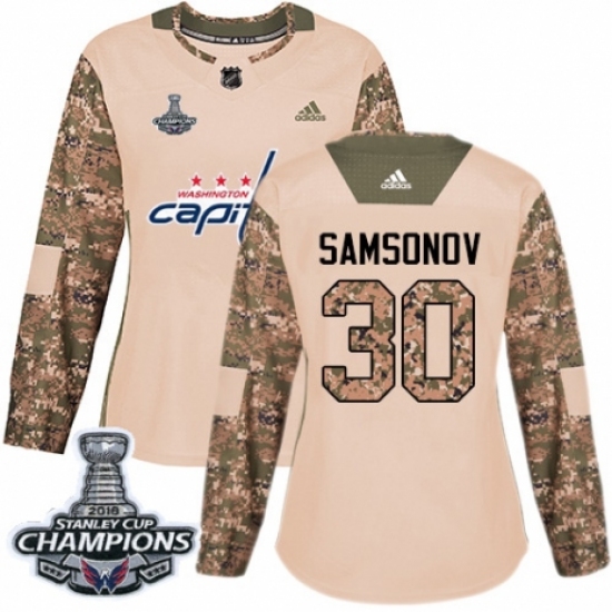 >Women's Adidas Washington Capitals #30 Ilya Samsonov Authentic Camo Veterans Day Practice 2018 Stanley Cup Final Champions NHL Jersey
