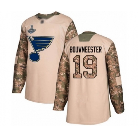 >Youth St. Louis Blues #19 Jay Bouwmeester Authentic Camo Veterans Day Practice 2019 Stanley Cup Champions Hockey Jersey