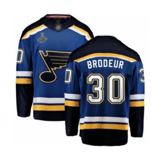 >Youth St. Louis Blues #30 Martin Brodeur Fanatics Branded Royal Blue Home Breakaway 2019 Stanley Cup Champions Hockey Jersey