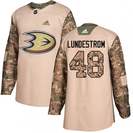 >Men's Adidas Anaheim Ducks #48 Isac Lundestrom Authentic Camo Veterans Day Practice NHL Jersey