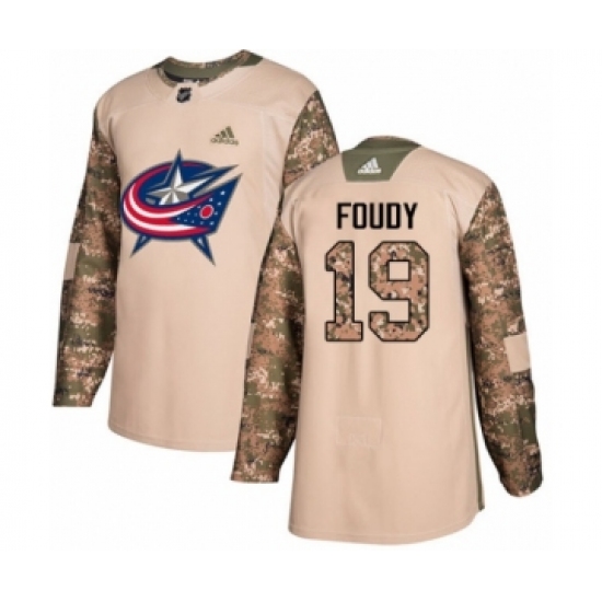 Men's Adidas Columbus Blue Jackets #19 Liam Foudy Authentic Camo Veterans Day Practice NHL Jersey