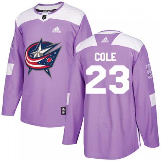 >Men's Adidas Columbus Blue Jackets #23 Ian Cole Authentic Purple Fights Cancer Practice NHL Jersey