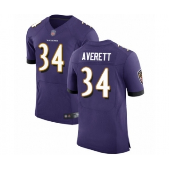 >Men's Baltimore Ravens #34 Anthony Averett Purple Team Color Vapor Untouchable Elite Player Football Jersey
