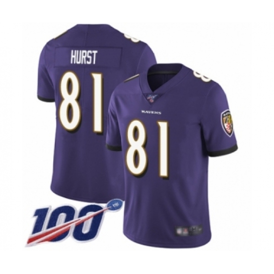 Men's Baltimore Ravens #81 Hayden Hurst Purple Team Color Vapor Untouchable Limited Player 100th Season Football Jersey