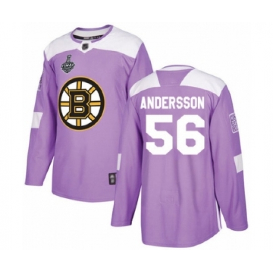 >Men's Boston Bruins #56 Axel Andersson Authentic Purple Fights Cancer Practice 2019 Stanley Cup Final Bound Hockey Jersey
