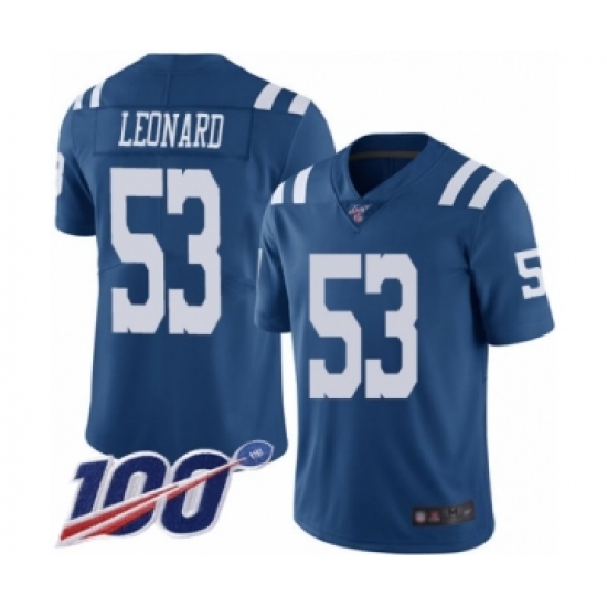 >Men's Indianapolis Colts #53 Darius Leonard Limited Royal Blue Rush Vapor Untouchable 100th Season Football Jersey