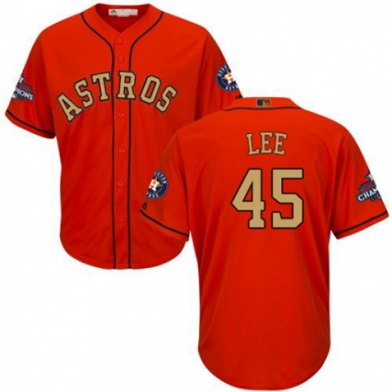 >Men's Majestic Houston Astros #45 Carlos Lee Replica Orange Alternate 2018 Gold Program Cool Base MLB Jersey
