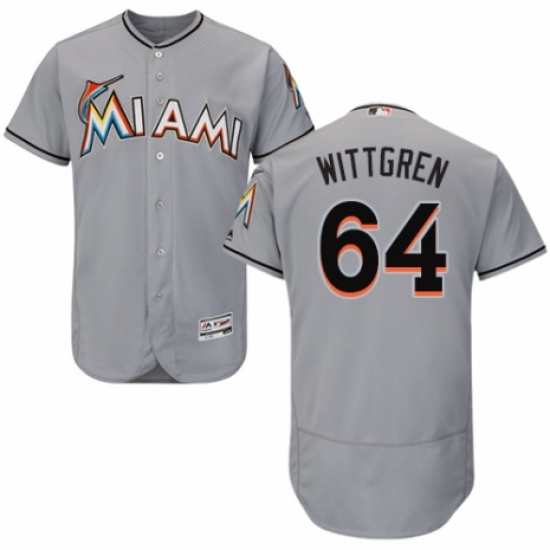 >Men's Majestic Miami Marlins #64 Nick Wittgren Grey Road Flex Base Authentic Collection MLB Jersey
