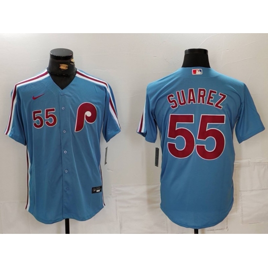 >Men's Philadelphia Phillies #55 Ranger Suarez Number Light Blue Cooperstown Cool Base Jersey