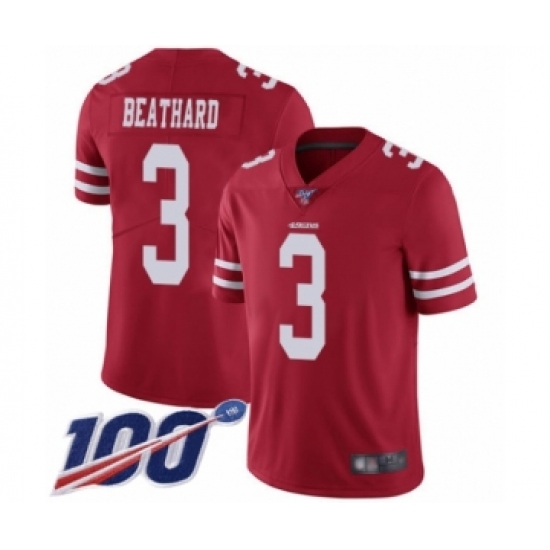 >Men's San Francisco 49ers #3 C. J. Beathard Red Team Color Vapor Untouchable Limited Player 100th Season Football Jersey
