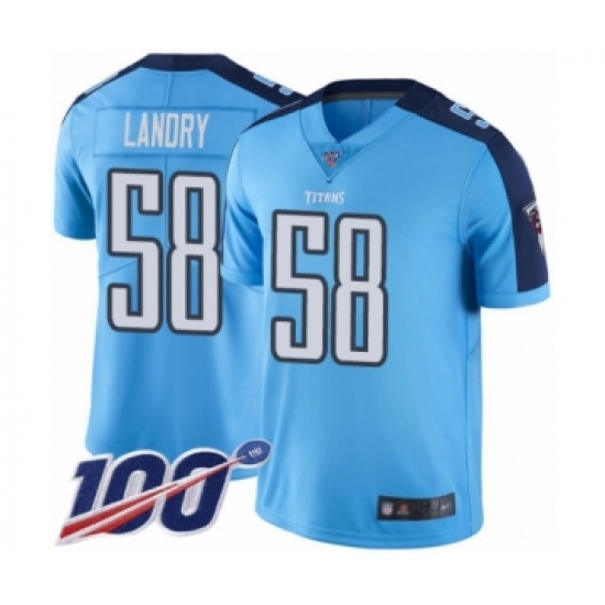 >Men's Tennessee Titans #58 Harold Landry Limited Light Blue Rush Vapor Untouchable 100th Season Football Jersey