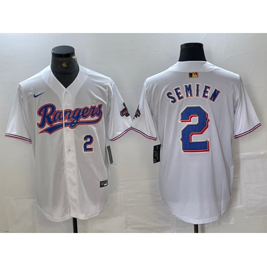 Men's Texas Rangers #2 Marcus Semien White 2023 World Series Flex Base Stitched Baseball Jersey