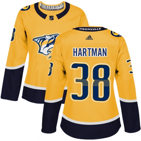 >Women's Adidas Nashville Predators #38 Ryan Hartman Authentic Gold Home NHL Jersey