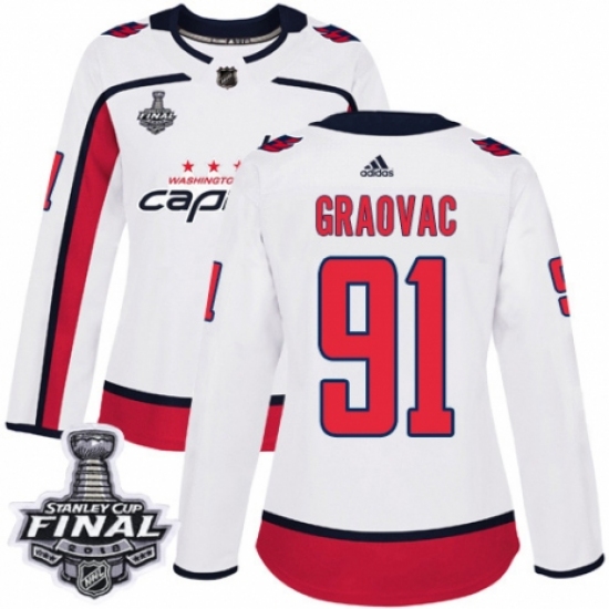 Women's Adidas Washington Capitals #91 Tyler Graovac Authentic White Away 2018 Stanley Cup Final NHL Jersey