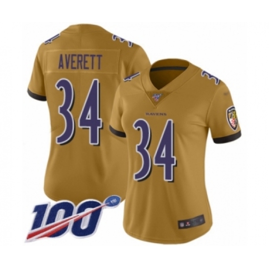 Women's Baltimore Ravens #34 Anthony Averett Limited Gold Inverted Legend 100th Season Football Jersey