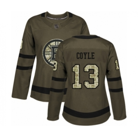>Women's Boston Bruins #13 Charlie Coyle Authentic Green Salute to Service Hockey Jersey