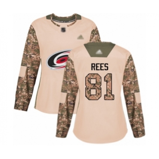 >Women's Carolina Hurricanes #81 Jamieson Rees Authentic Camo Veterans Day Practice Hockey Jersey