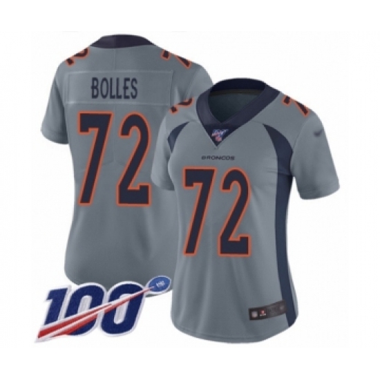>Women's Denver Broncos #72 Garett Bolles Limited Silver Inverted Legend 100th Season Football Jersey