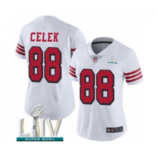 >Women's San Francisco 49ers #88 Garrett Celek Limited White Rush Vapor Untouchable Super Bowl LIV Bound Football Jersey