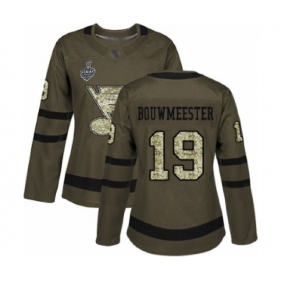 >Women's St. Louis Blues #19 Jay Bouwmeester Authentic Green Salute to Service 2019 Stanley Cup Final Bound Hockey Jersey