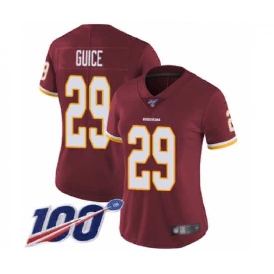 >Women's Washington Redskins #29 Derrius Guice Burgundy Red Team Color Vapor Untouchable Limited Player 100th Season Football Jersey