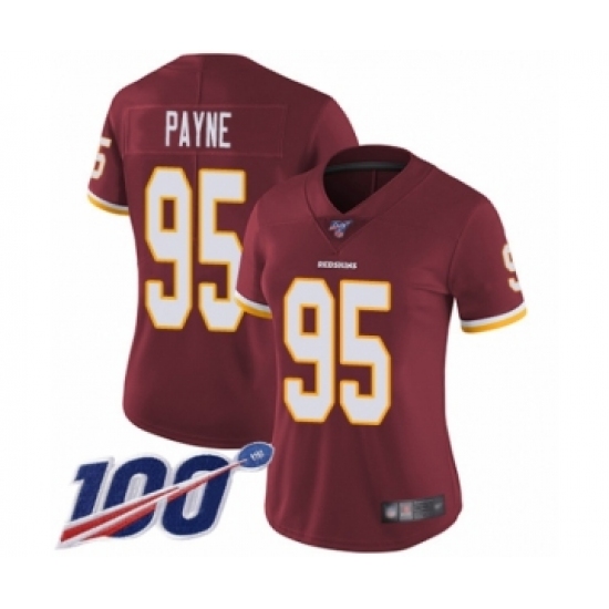 >Women's Washington Redskins #95 Da'Ron Payne Burgundy Red Team Color Vapor Untouchable Limited Player 100th Season Football Jersey