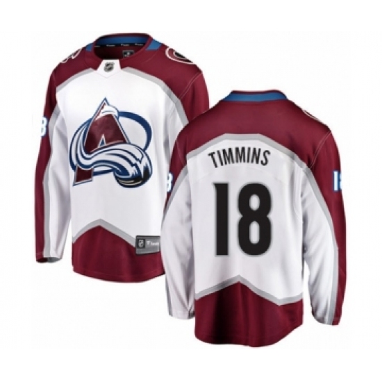 >Youth Colorado Avalanche #18 Conor Timmins Authentic White Away Fanatics Branded Breakaway NHL Jersey