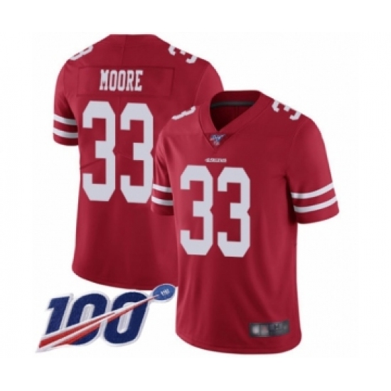 >Youth San Francisco 49ers #33 Tarvarius Moore Red Team Color Vapor Untouchable Limited Player 100th Season Football Jersey