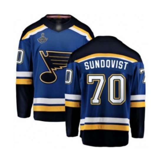 >Youth St. Louis Blues #70 Oskar Sundqvist Fanatics Branded Royal Blue Home Breakaway 2019 Stanley Cup Champions Hockey Jersey